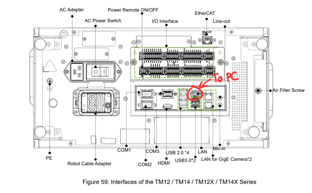 My communication is simply set up using this LAN port connected to the PC, enabling TCP communication with a fixed IP in TM Flow, so the robotic arm receives signals as a Modbus slave. The port being used is captured below, just to ensure that there is nothing wrong with the wiring and communication.