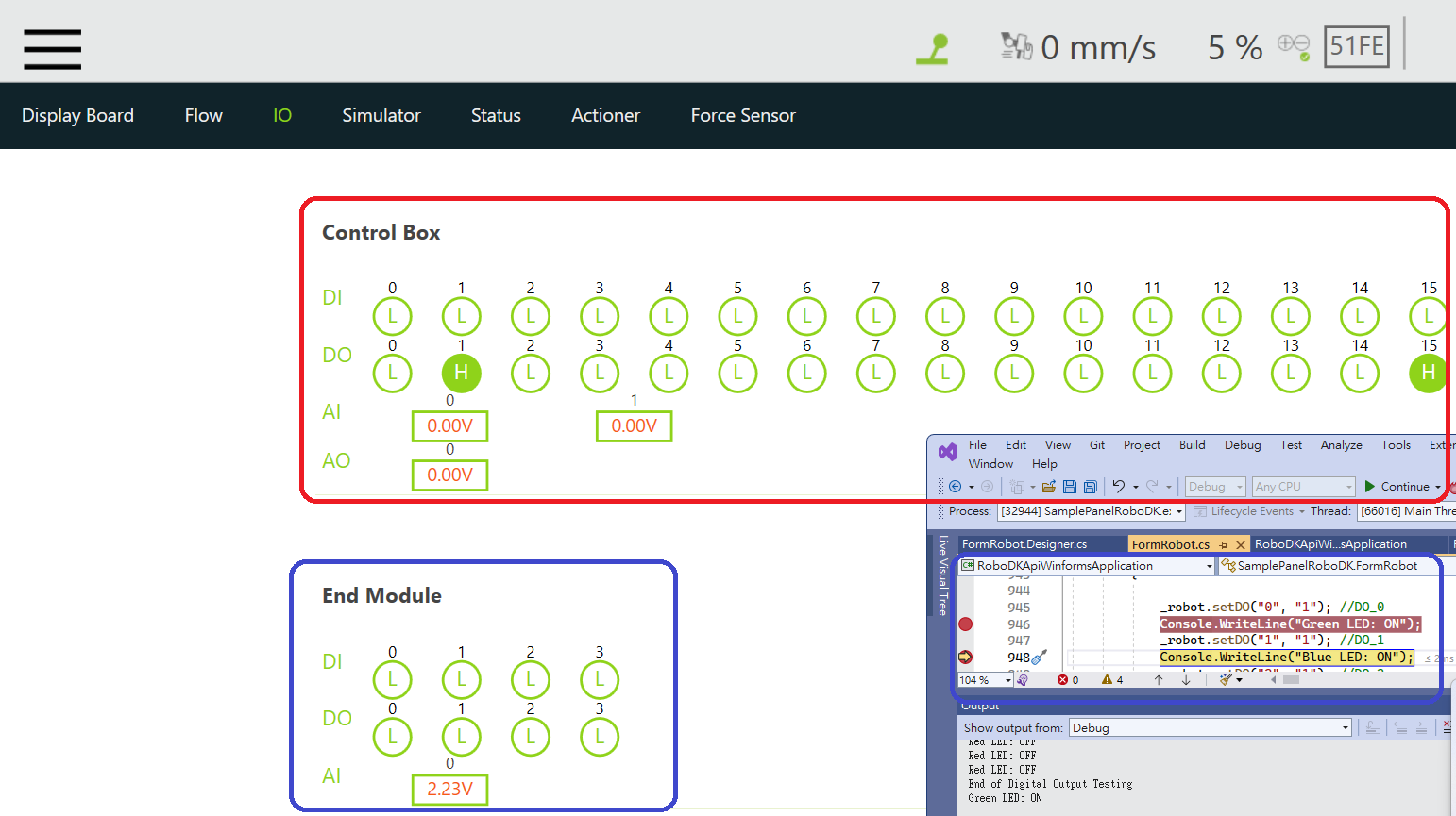 Please note that I am controlling the Tool end DO instead of the controller DO. For the Tool end circuit configuration, I am using LEDs for simple ON and OFF testing.
