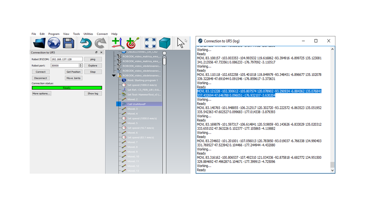 When using the moveP command, we need to select the appropriate postprocessor (in our case we use: Universal Robots MoveP) and then the 'Send program to robot' command. In this case, we also cannot run simulations in RoboDK and URSim simultaneously.