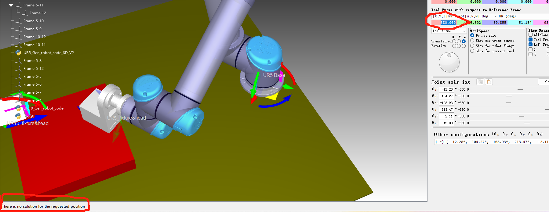 Besides, I also cannot change the coordinates of Tool Frame with respect to Reference Frame to change the robot posture. RoboDK will show 'There is no solution for requested position" at left corner of roboDK main interface, as shown in attached Fig2.