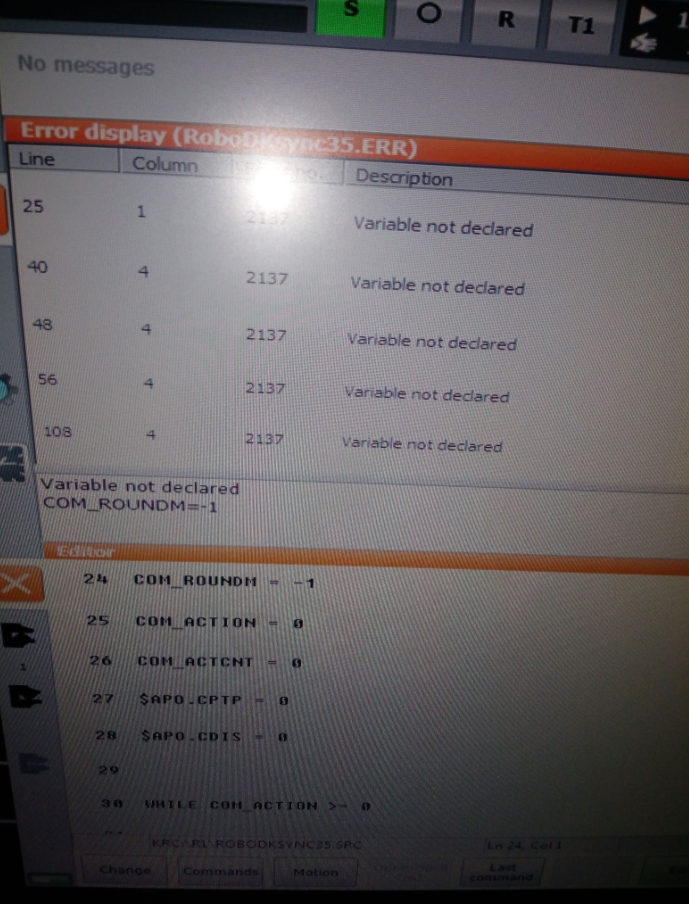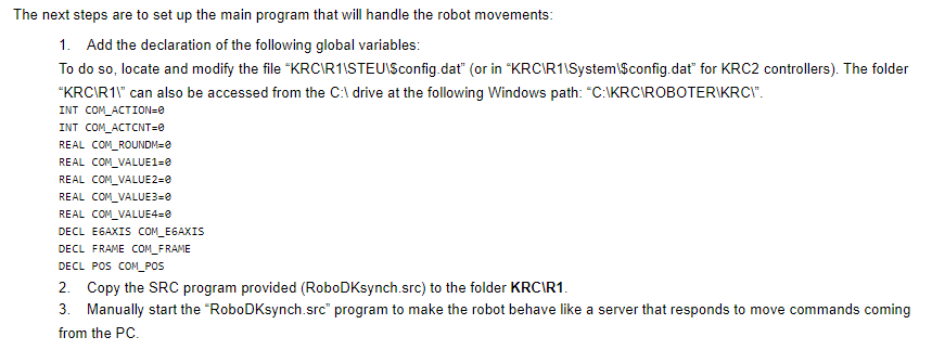 4 - Any other problem that could restrain the KRC4 controller to execute the global variable declaration code, therefore, restrain the KRC4 controller to recognize the variable used by RoboDKsynch.src.