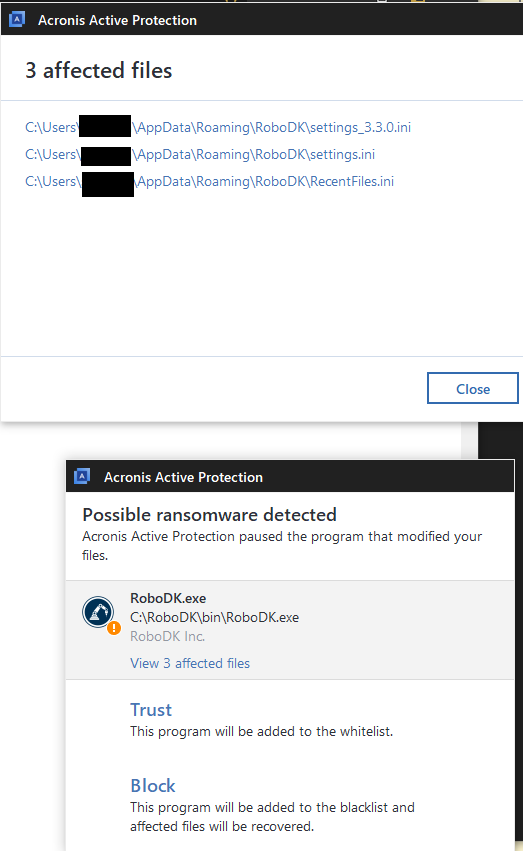 RoboDK seems reputable, I saw nothing wrong with the *.ini files it was complaining about. Curiously, they did contain a large ByteArray. I'm not sure how this works, but maybe it saw some bytes it didn't like. I am not super familiar with this Acronis backup utility, especially as AV. Nothing looked out of place, though my malware analysis XP is lower than it used to be these days, and threats are more sophisticated and well-funded than ever. We did find a RAT lurking on a mass storage device that was supposed to be empty and new in box (albeit it wasn't).