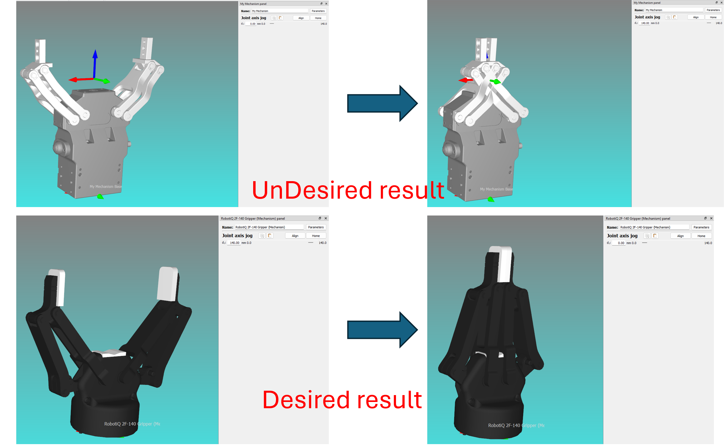 Please consider that I have already tried the 2-finger gripper mechanism creating method from the Utilities menu, which didn't give the exact result that I wanted. (Please refer to the attached image)