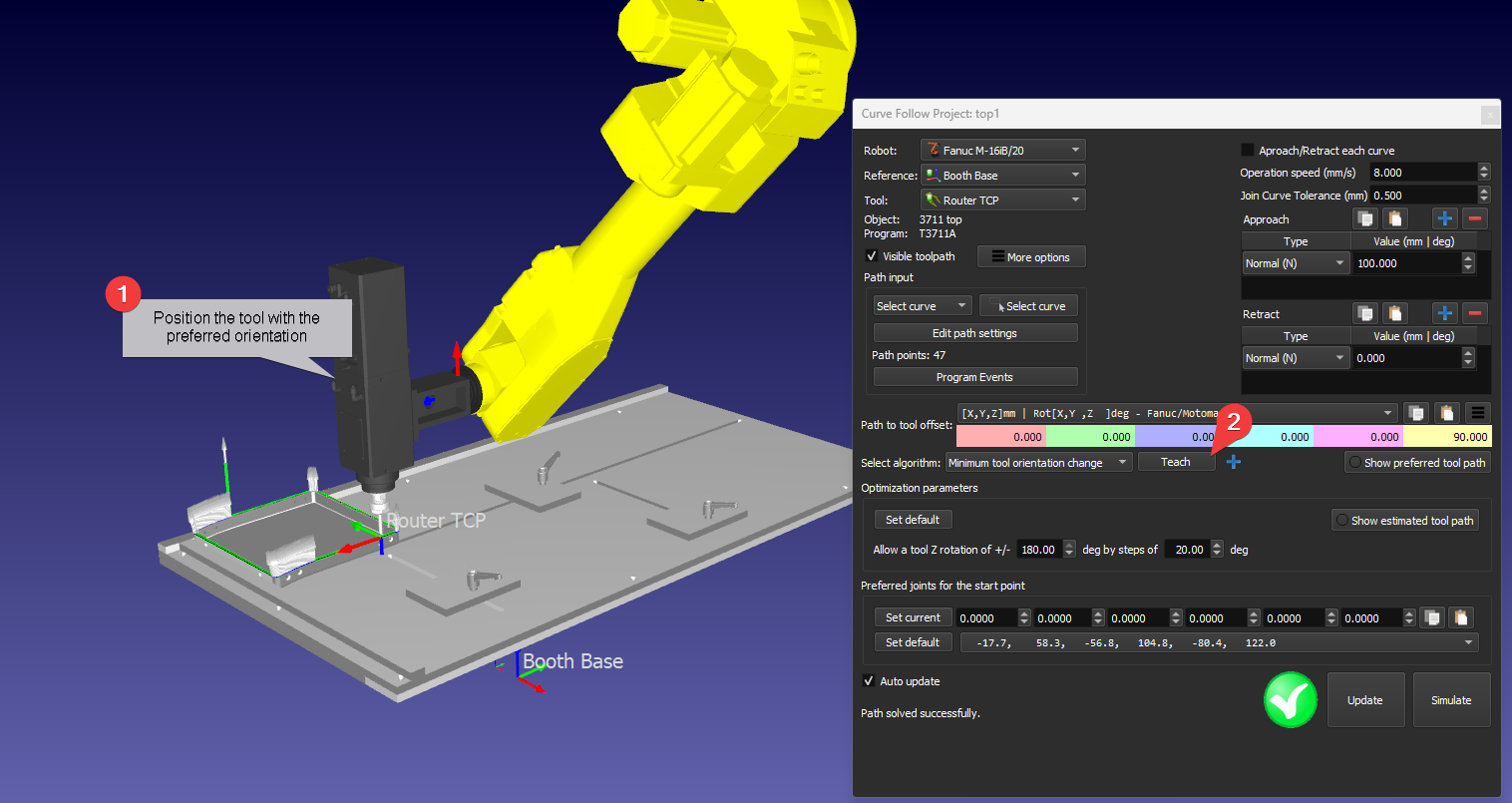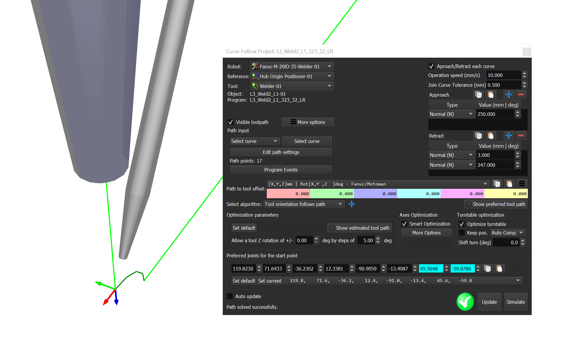 Good morning! I'm not sure if this is a bug but it seems like it might be. I've attached the work cell in question with this post. If you run the programs T3711B or T3711D you will see strange behavior despite the settings that I have for the programs in question. I have "Allow Z a Tool Rotation +/- 0 deg by steps of 20deg" set on for both program settings but you will still see Z rotation about the TCP despite this. Is this a bug or is this something that's going on with the imported path from SolidWorks? Any assistance with this would be greatly appreciated, thanks! I know for a fact that the robot can do that movement without rotating so it's very curious why the simulation is having the robot rotate the way it is.