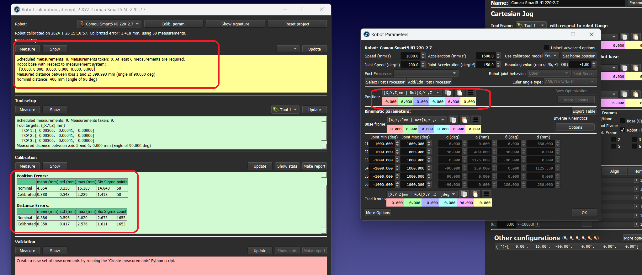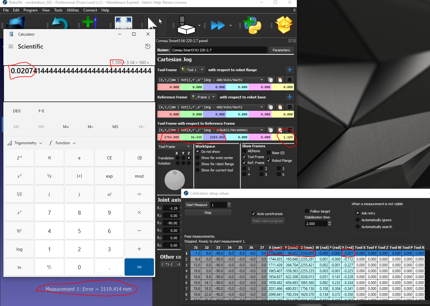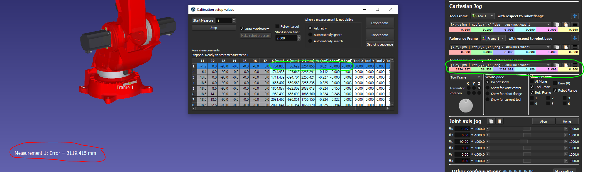 3. Unfortunately, calibration was fully unsuccessful. I imported my data and despite the measurements matching the nominal FK fairly closely (green annotation, below), the measurement error for each point was still in the 3 meter range (red annotation, below). I suspect this is a consequence of the poor base setup results in issue (1).