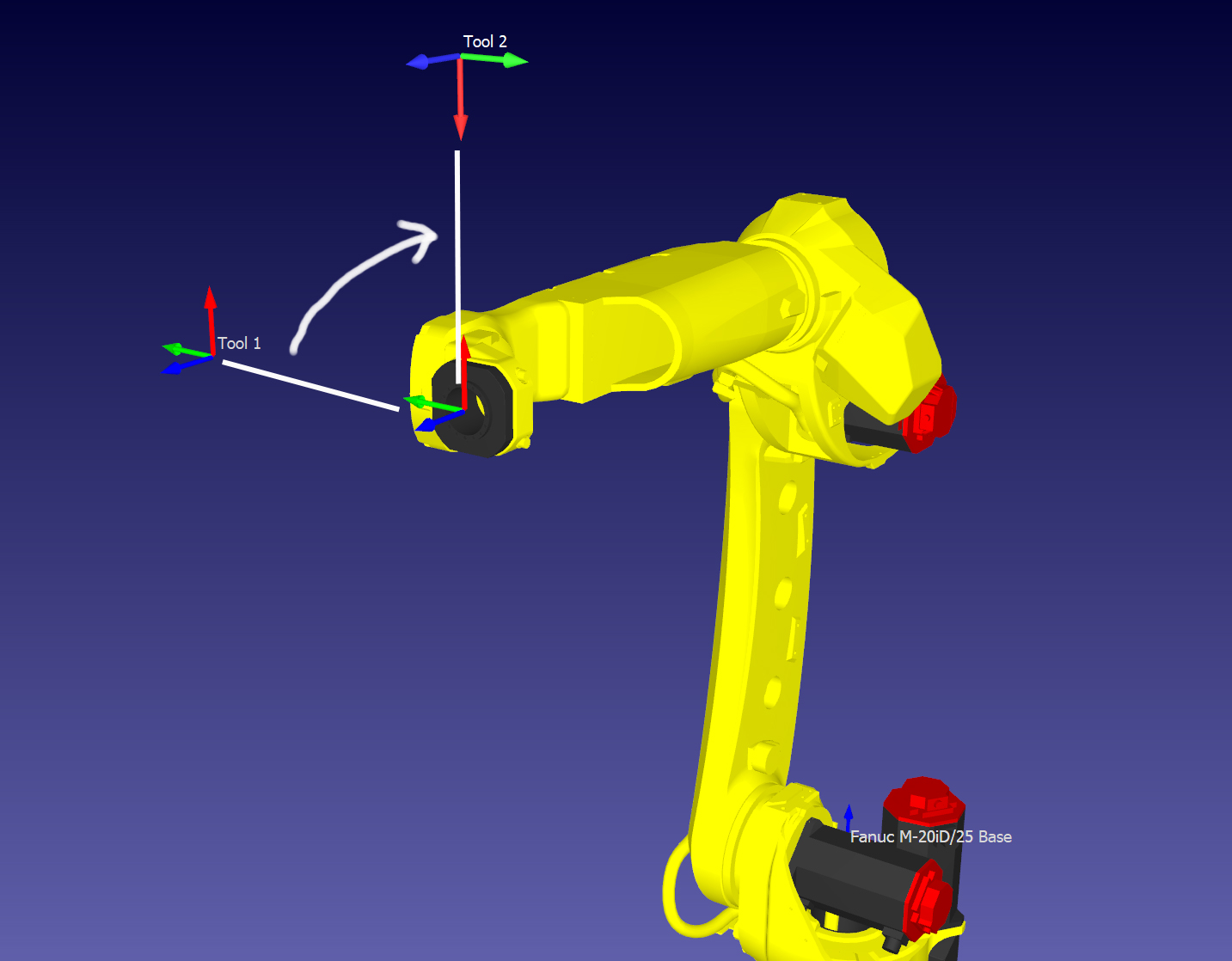 I am using the C# API to import tool coordinate systems that were created in SolidWorks and attach them to a robot. I am importing the 4x4 matrix data that solid works uses and converting it to the 4x4 matrix format that RoboDK uses, which is working fine. The thing I can't figure out how to do is rotate these imported tool coordinate systems around the robot flange coordinate system, since they are importing in a different orientation from what I need. If I just rotate the matrix by multiplying it by another matrix that represents the rotation I need, it rotates about the tools origin and not the robot flange origin, which is to be expected. What I need to do is rotate around the flange origin as seen in the attached image. I really can't figure out how to do this from the RoboDK user interface as well, changing parameters always operates around the tools origin. With reference frames you can specify another reference frame so that relative rotations can be done, but this does not seem to be the case with tool objects. Ideally I just need the way to do this programatically using matrix math on the tool matrix prior to adding it to the robot, since this has to be an automated process involving several tools on a rotary tool head.