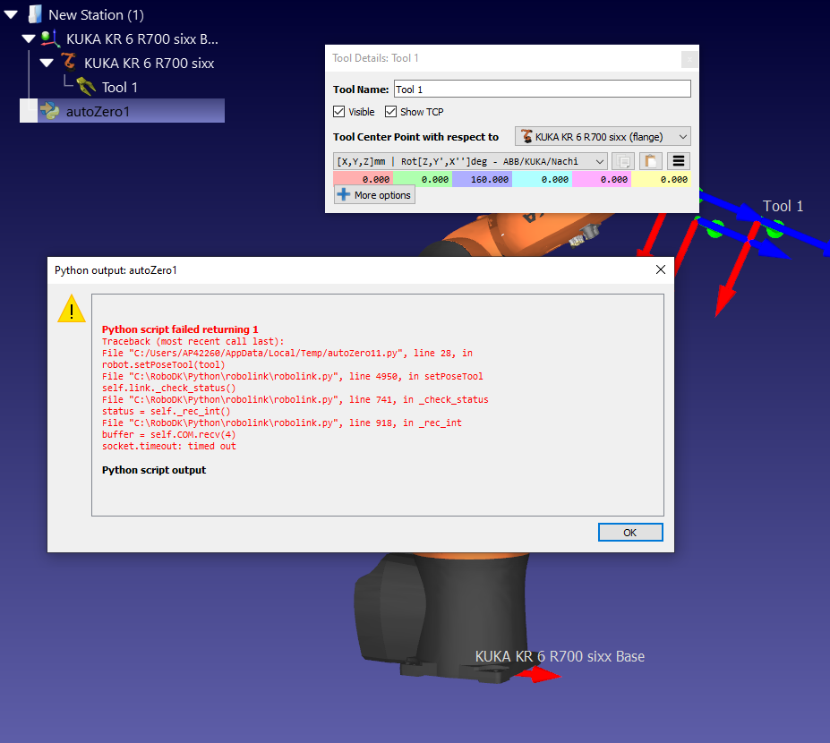 I'm trying to run Python program offline (code is attached). In roboDK, I added a Tool1 with defining his position, but I had a Python script failed as return (see screenshot). What is the problem ?