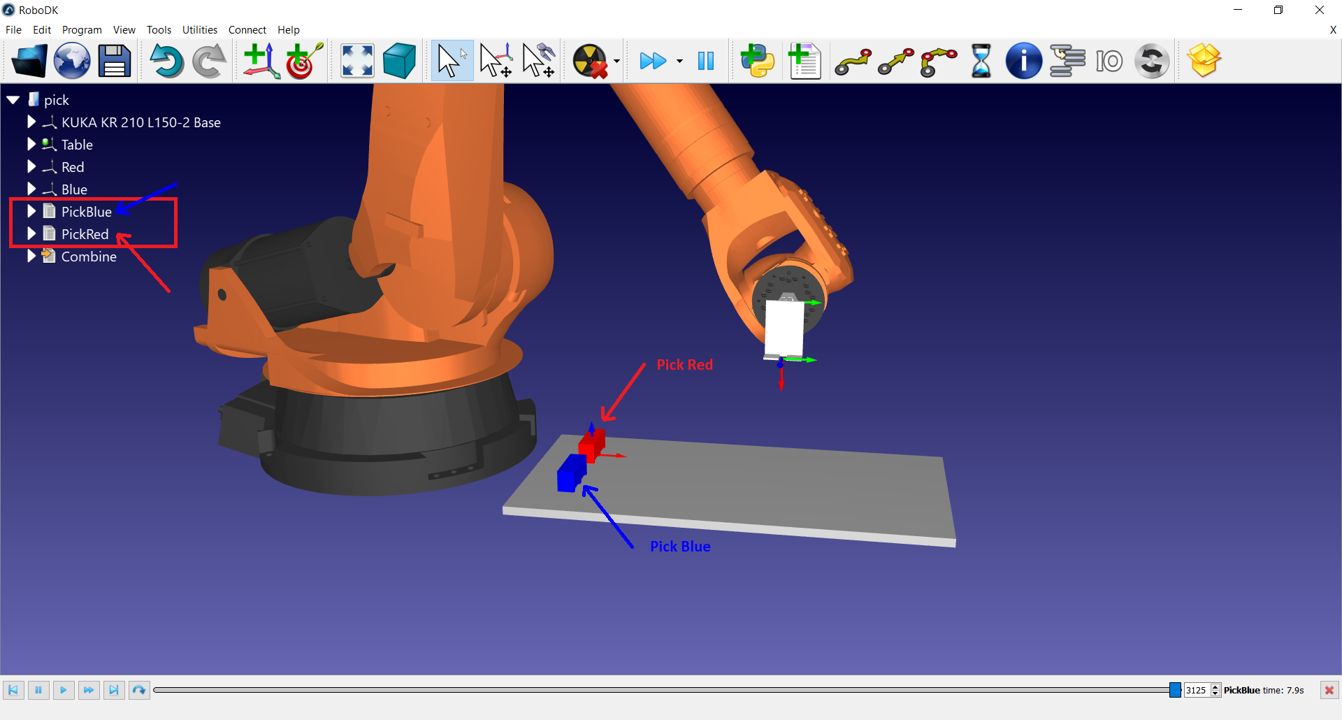 There are two programs in this simulation, one is to pick the blue box (PickBlue) and the other is to pick the red box (PickRed). I want to create a user pop-up button where users can press either "blue" or "red", and after the user selected a color in the pop-up tab, then the corresponding program runs. I would like to ask if this is achievable? If so, how? My first idea is to use the API and call the program in, but I am not sure if this is the correct direction and also not sure how to do it with the API.