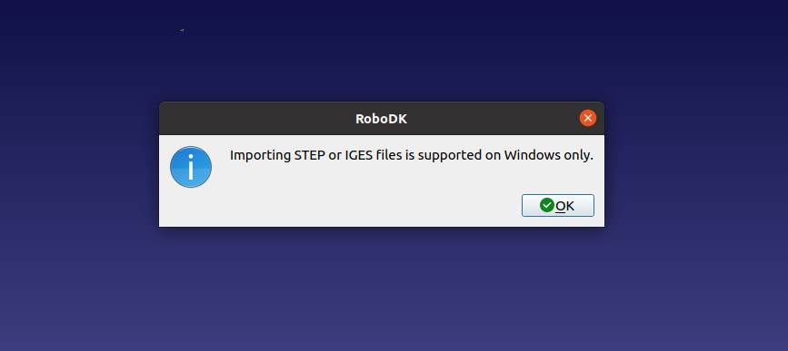 thank you for the reply, currently, I don't have a windows machine, of course, I'm using the .stl as the only viable format to share 3D models between CAD and RoboDK, I was wondering why .step and .iges are not supported in Linux, I would expect the same features between RoboDK in Windows and Linux.