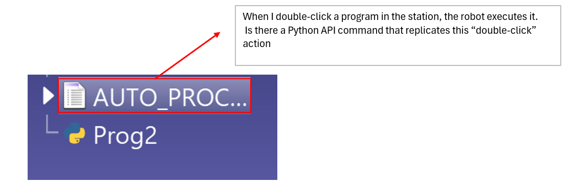 When I double-click a program in the station, the robot executes it. Is there a Python API command that replicates this “double-click” action (i.e., execute on the robot)? My goal is to automate the entire process from program creation to execution on the actual robot.