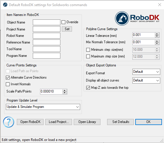 The images "SolidWorks RoboDK Addon Settings" and "RoboDK CAD Settings" show my SolidWorks settings and RoboDK CAD settings respectively.