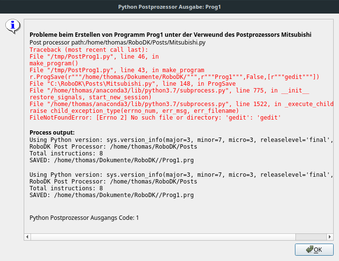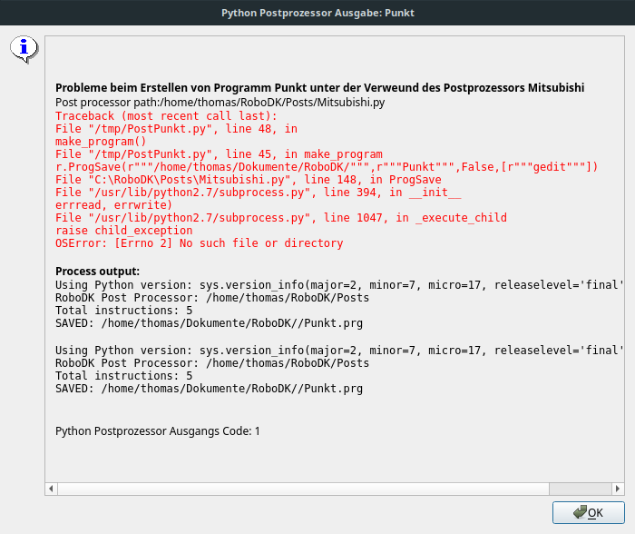 thank you for your help. I found the text editor option and set it to the correct path. This works. I have found a generated file inside my tmp folder (see attached file PostPunkt.py) Unfortunately I get another error. (see attached file error_2.png)