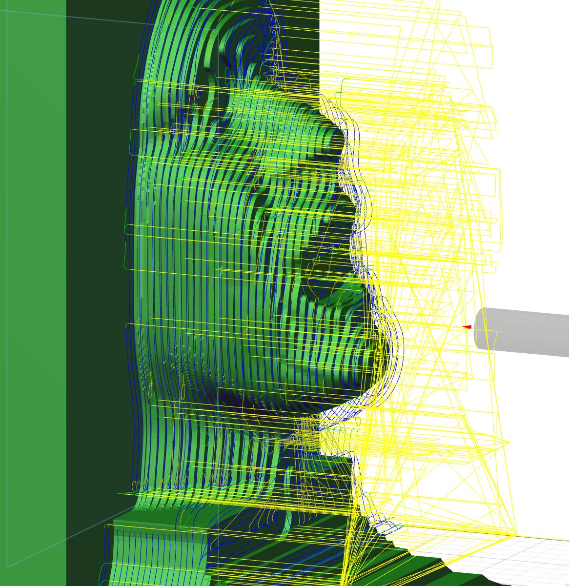 This is how the CAM calculation looks in Fusion360. The tool path is correct and not too much material is removed during the roughing process.