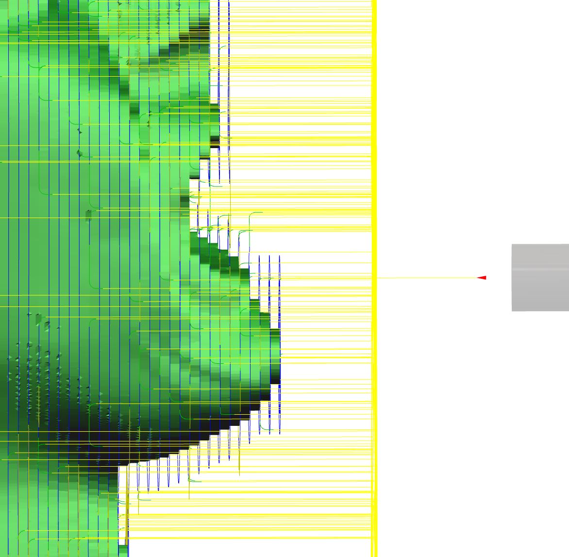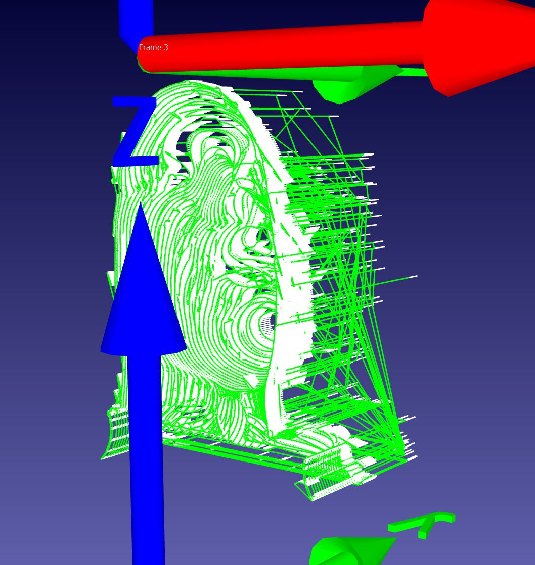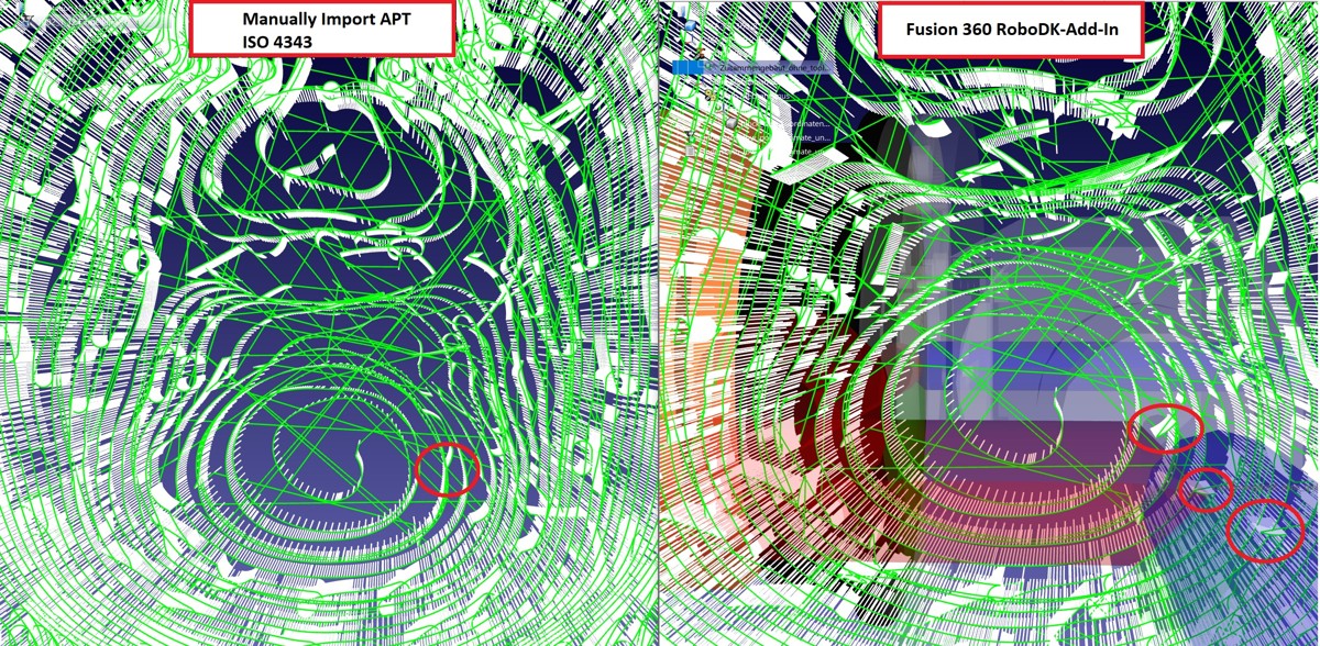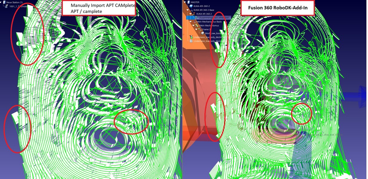 This is how the path looks in RoboDK. Even though it's hard to see, the path looks good so far. I can't see any movements that would explain the faulty milling to me.