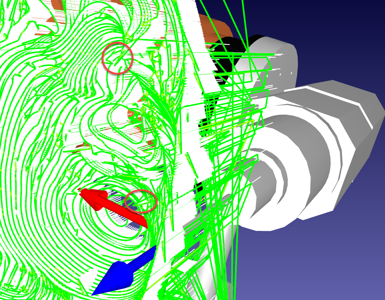 In reality, the result looks like this. At the point marked in red, the milling head moves much too deeply into the material. Such errors happen again and again on the test parts. Fortunately, this error has already occurred in line 5500 and I have observed it with my own eyes. The milling tool repeatedly enters this position cleanly. A sporadic electrical fault can thus be ruled out. It looks like material has been removed from the blue arrow in the wrong place one layer before. First I suspected that the $ADVANCE =3 is too large and therefore the accuracy is too low. Unfortunately, even a $ADVANCE =1 brought no change, the tool moves exactly the same in the red marked zone