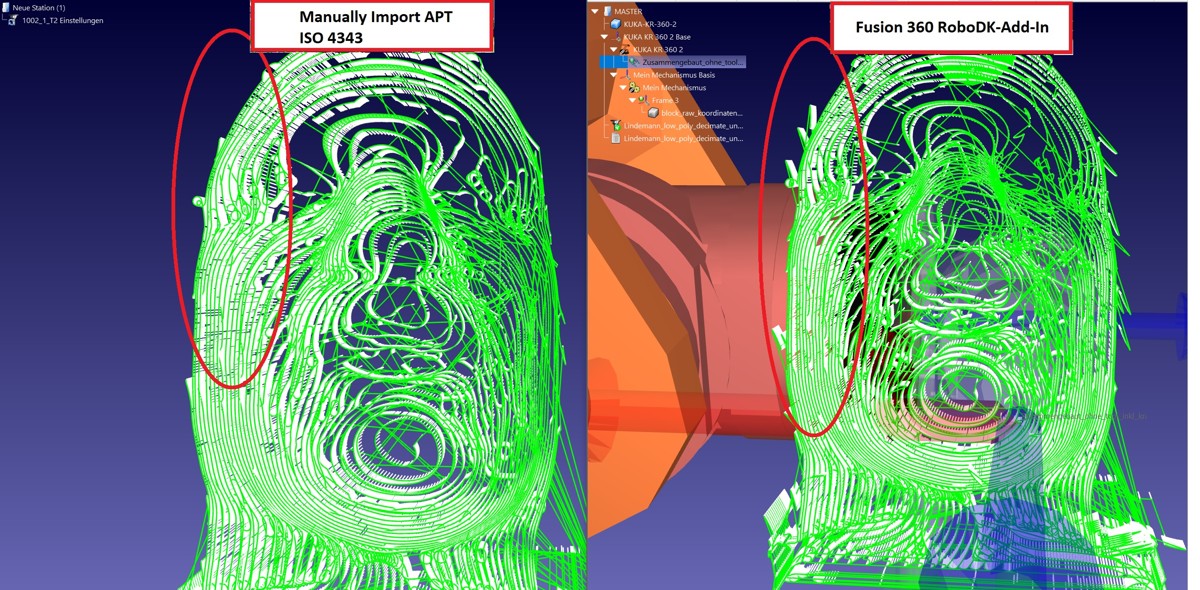 To be on the safe side, I also loaded the model of Fusion360's simulation into RoboDK, no path penetrates the model.