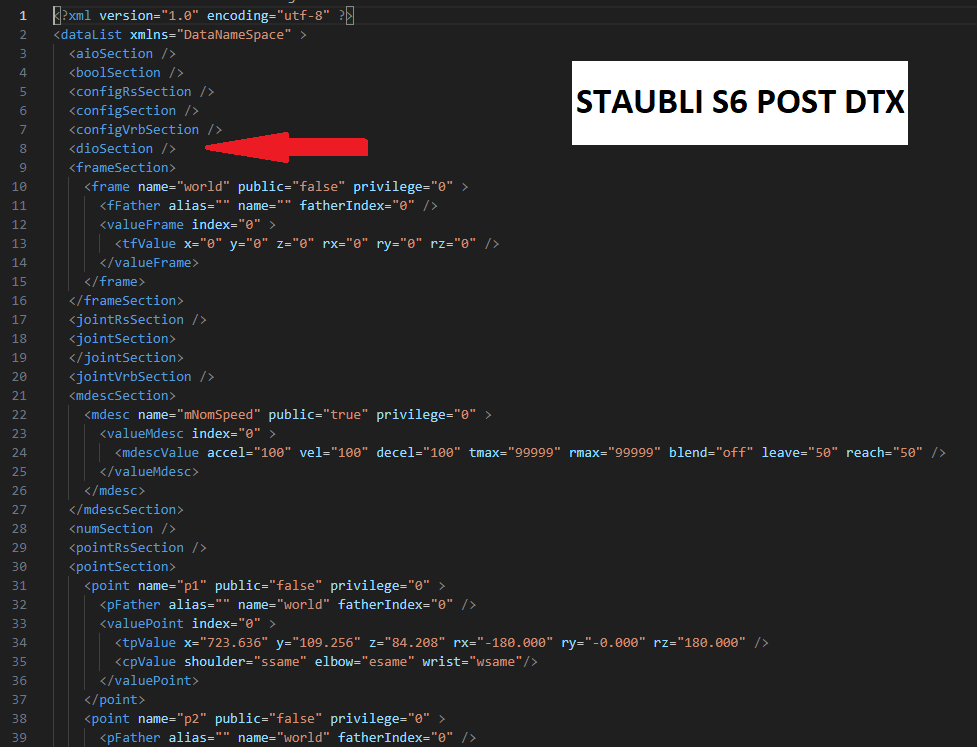 This post processor creates all the points/joints that I set in RoboDK, I am able teach/view all of them in the pendant as well, but I think the issue with this post is that it does not generate the Digital IO data in the DTX file (see pic). When I run an application on the control that has any outputs with this post it results in a error log "invalid name" for the outputs. When I search for the output name in the DTX file its not there. So far this post has worked the best for producing all the points and joints I've programmed, but it appears to be limited to a single frame. How can this post be edited to output the IO?