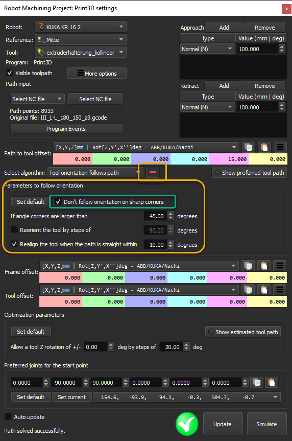 2. The movements at the beginning and end become very unpredictable. More critically: The Robot crashed into the print bed during a PTP move, although the simulation looked fine.