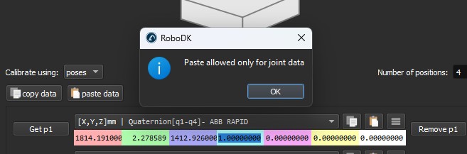 Are the differences I'm seeing due to the fact I'm only entering the joint values to 1 decimal place? I was able to save the points to a file, but they are in ABB format. I was going to try to enter them, but the input boxes will not allow pasting of individual values (the paste routine should be updated to detect a single double value and allow the paste).