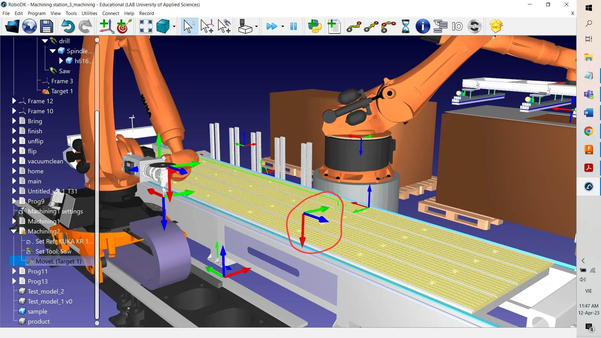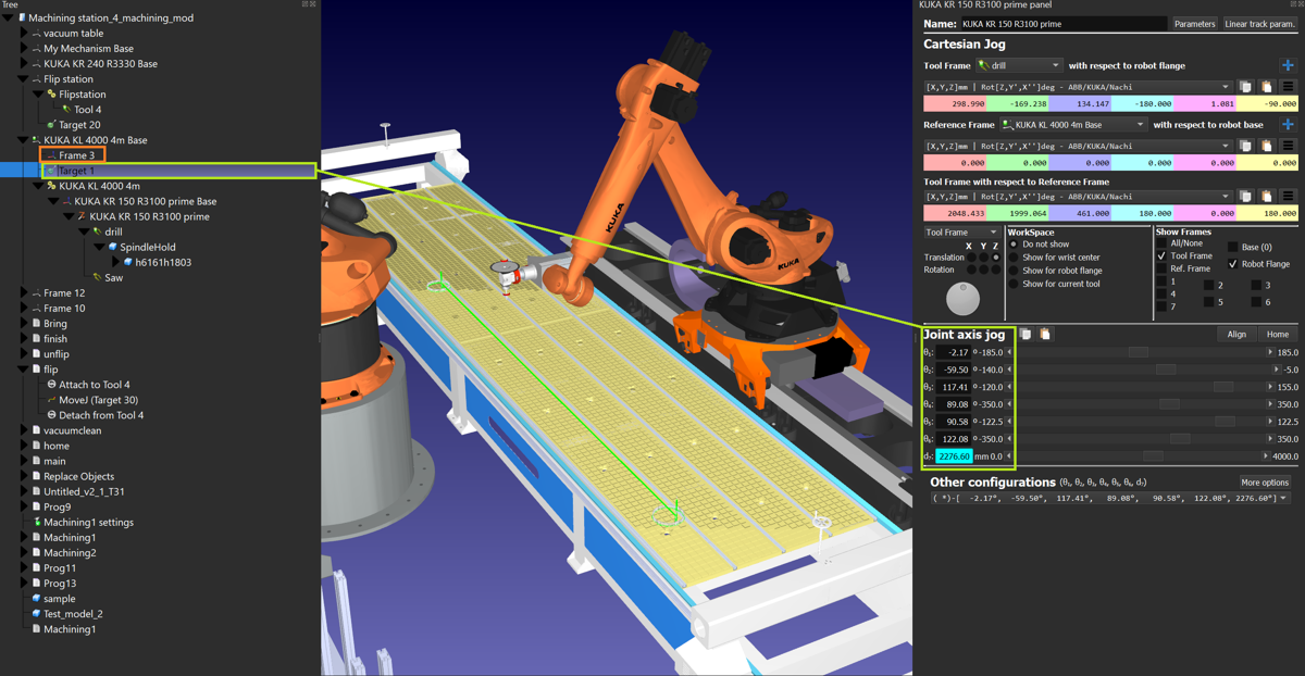 I have problems getting the machining robot (the one on the rail) to move to desired location. I thought it was because I have set up things incorrectly, such as did not notice to choose the desire robot other than the default one. Now the target appears at the right position (frame in red circle) and I have linked the correct robot in charge, I want to test only a small linear movement but it still does not work because from my view, this target position is definitely feasible.