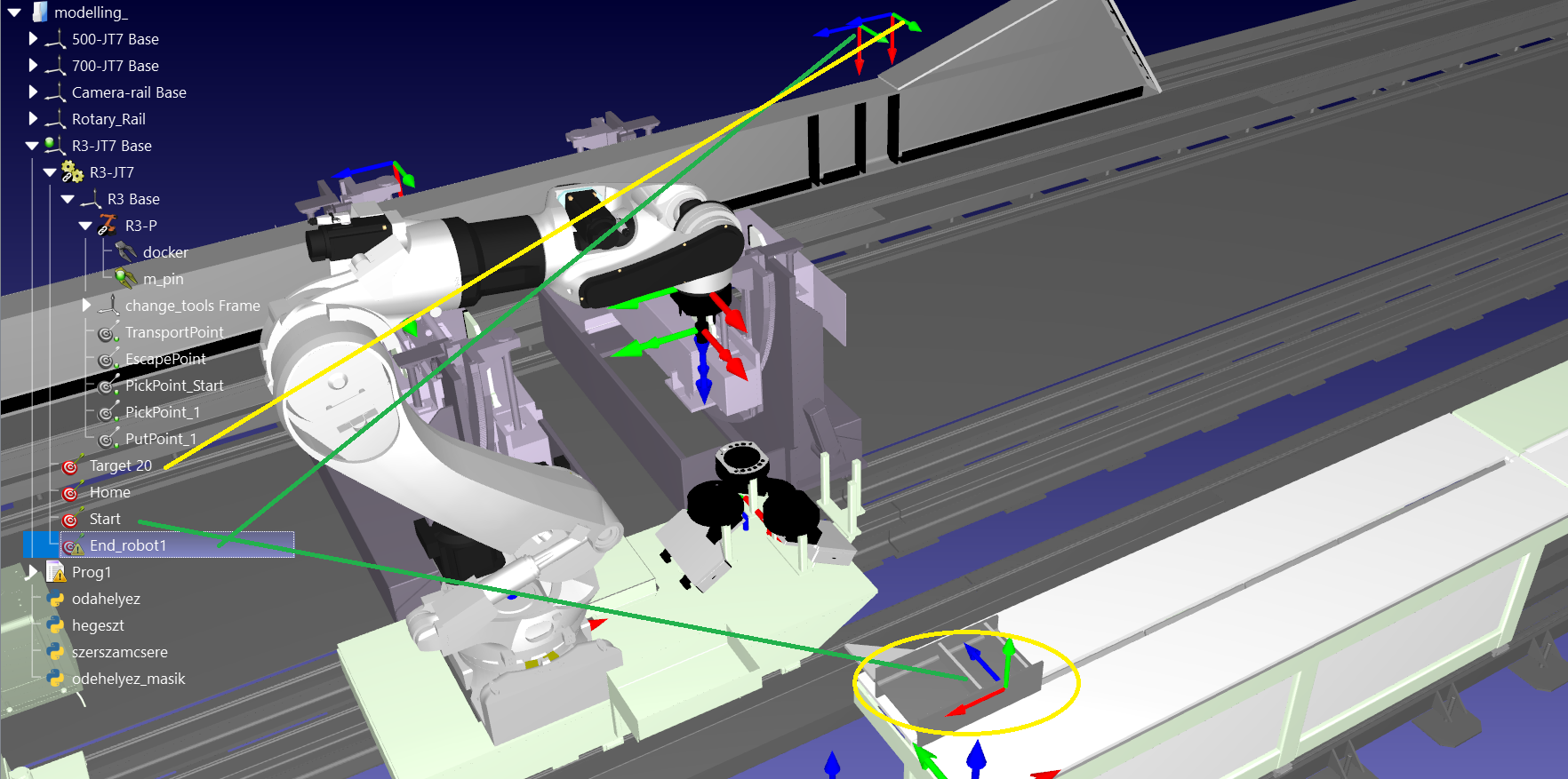The other attachment shows the situation I'm struggling with. I would like to move the workpiece circled in yellow from the "Start" position to the "End robot1" position. The "Start" gripping point was picked up by the robot(teach target) and the "End robot1" point was calculated using the python api. "Target 20" was also picked up by the robot for checking the reachability of "End robot1". So I think my question is very similar to the original question, the robot in the linear rail can't reach the calculated target (although it is reachable).