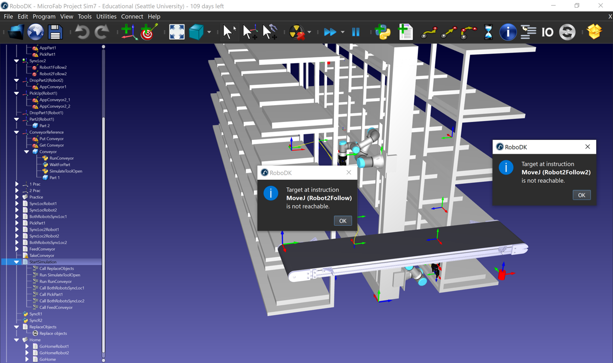 For some reason, all my programs work and shows the correct animation when I click one by one. But when I make a main program to make them all run with a click, errors like "MoveJ () is not reachable" pop up. The correct animation even happens in the background while the errors pop up. How come this happens?