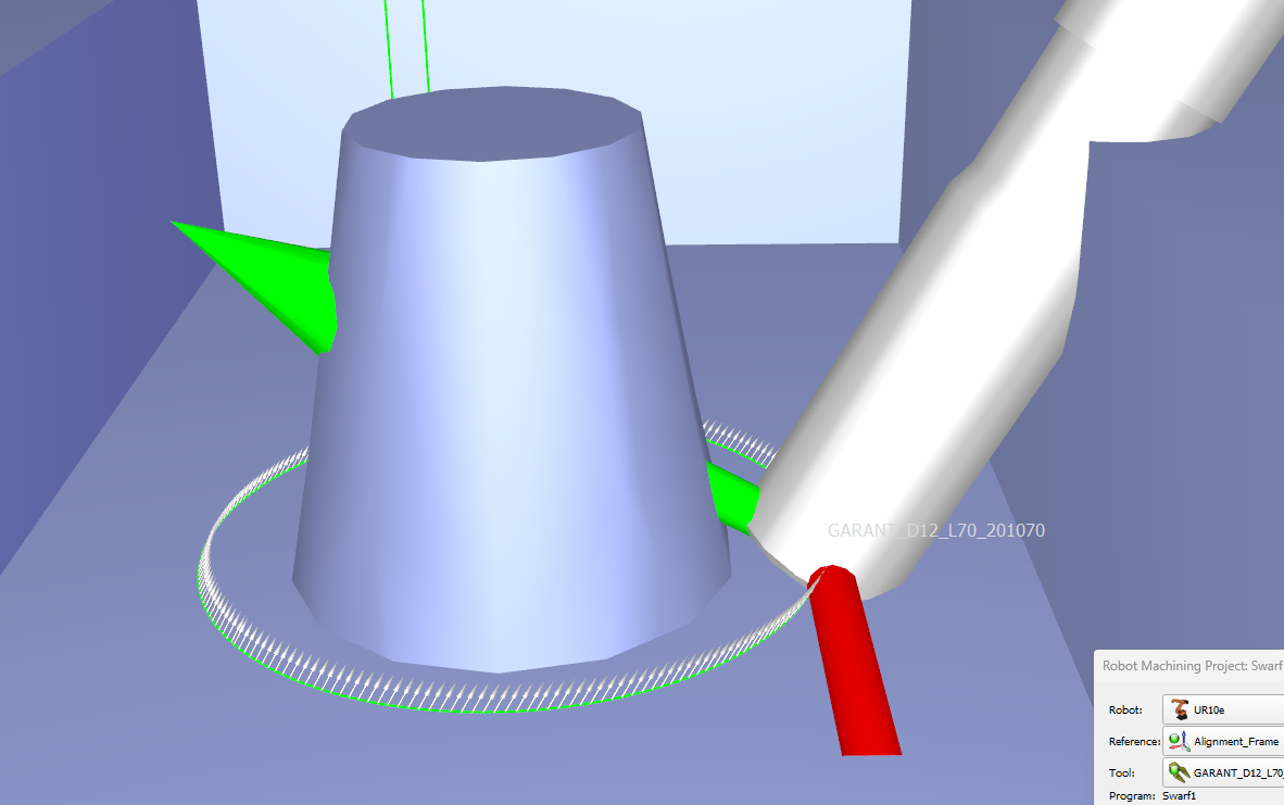 However, upon exporting the NCCode and importing it into RoboDK, the tool does not retain the correct orientation. This can be observed in the following image. The likely cause of this is the path normals, which are all parallel. Ideally, these normals should consistently point in the direction of the cone.