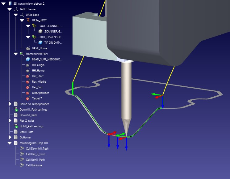 I'm working on a liquid dispensing application and having problems using the curve follow project to to dispense on the surface shown in the attached picture while controlling a large tool's Z rotation to prevent collisions with the surface.