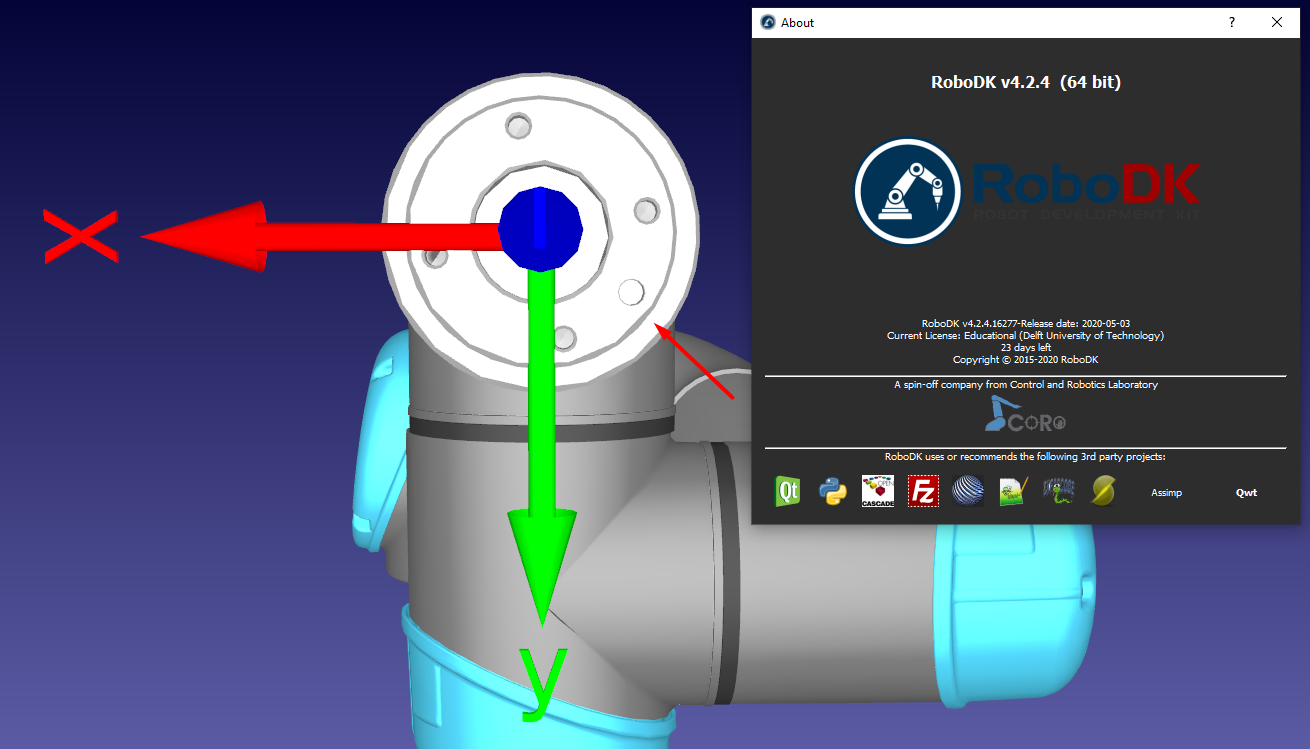 Second image shows the flange in RoboDk. The connector (not visible, but the position is indicated with the arrow) is not on the Y axis.