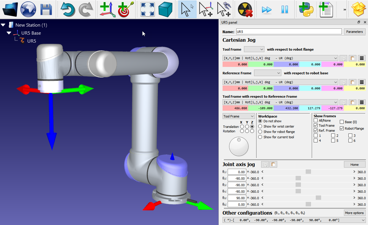 With the UR5 model, if I set the joint angles to [0, -90, -90, -90, 90, 0], the orientation of the Robot Flange/Tool Frame with respect to the Reference Frame (set as UR5 base) is shown as [0,0,0] (the full pose is shown as [486.080, -109.000, 432.200, 0, 0, 0]), in the "Tool Frame with respect to Reference Frame" panel.