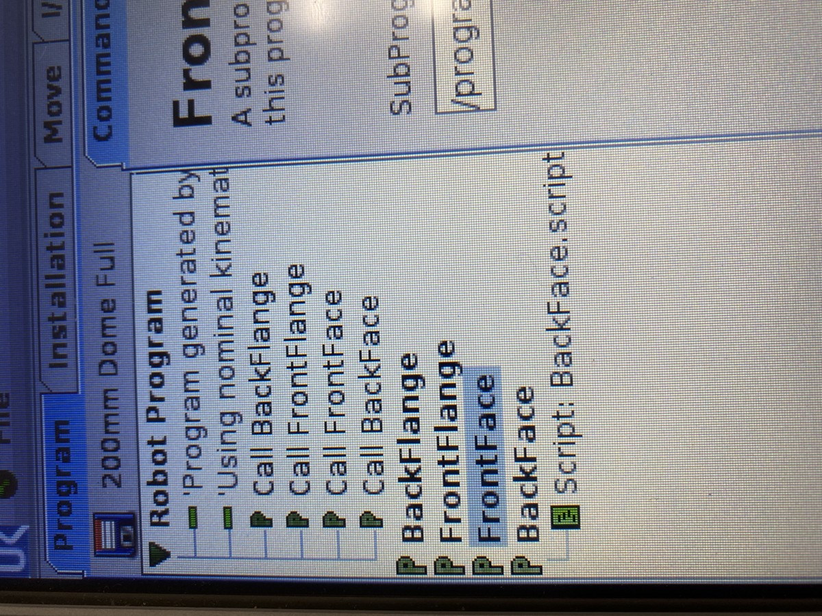 In the photos, the "BackFace" subprogram is the troublesome one. You can see above it, the subprogram "FrontFace" was loaded in correctly (subprogram instructions are hidden for one photo, and shown in the other).