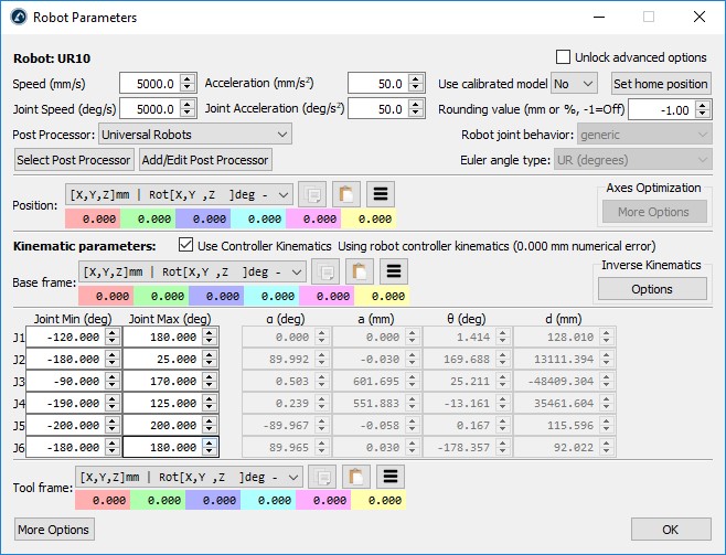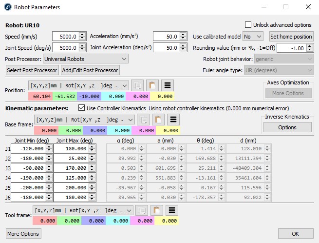 The Robot Parameters screen tells me that default kinematics will give a 36.489mm numerical error relative to the updated kinematics.