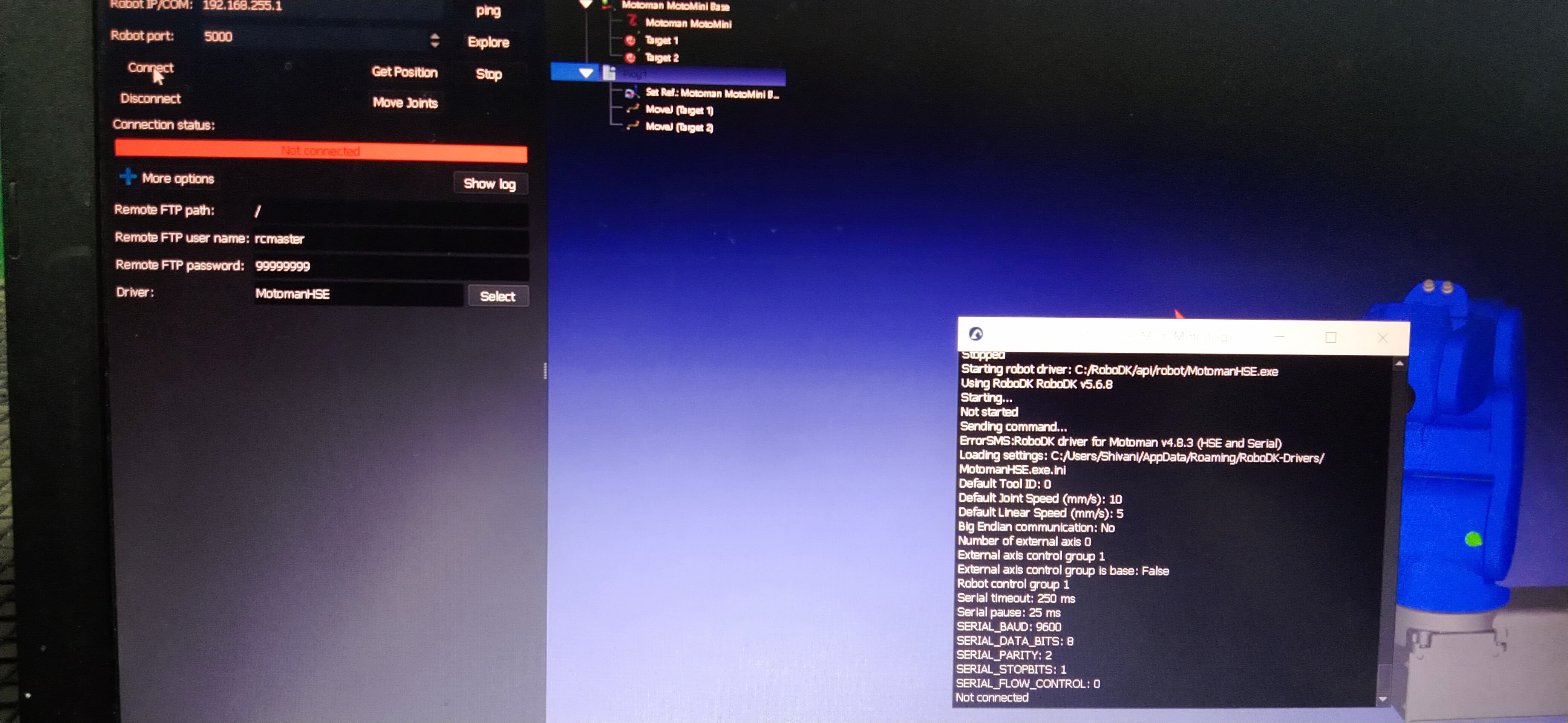 I tried with your Yaskawa MotoMini robot attached whose pulse/degree parameter is already defined. When we are trying to connect robot with RoboDK we are receiving the attached problem please provide the solution on the same.