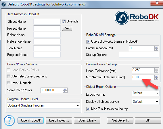 made something similar to the sample video for sw plug-in auto setup. the object and path transfer to robodk without problem. however, the last point of the curve, the tool orientation does not fall between the two picked surfaces. as i understand, it is not possible to change orientation for just one point one the curve.
