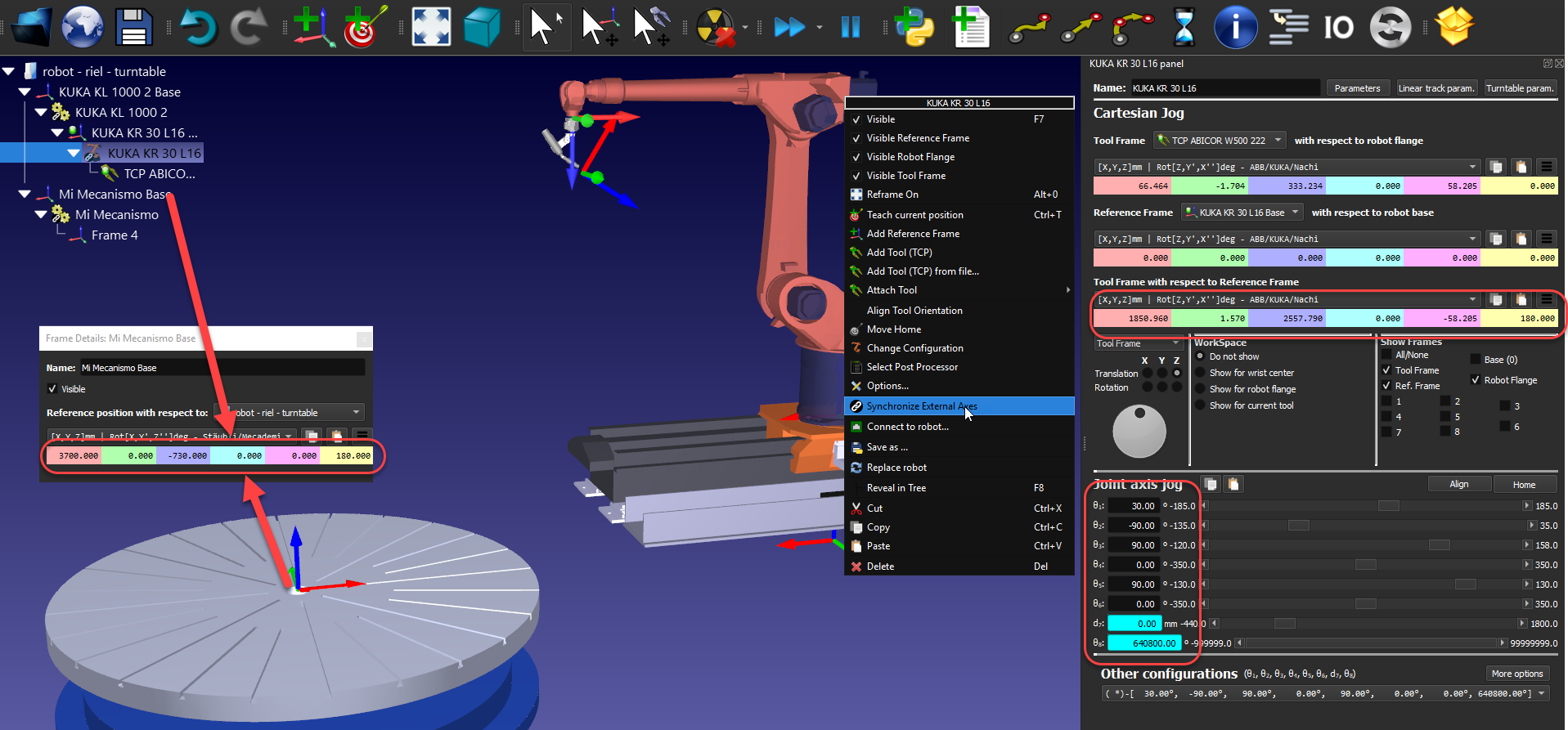 Important: Every time you make a change in the root position of the turntable you should right click the robot, select "Synchronize External Axes" and simply select OK. This will update the coordinates in your robot panel.