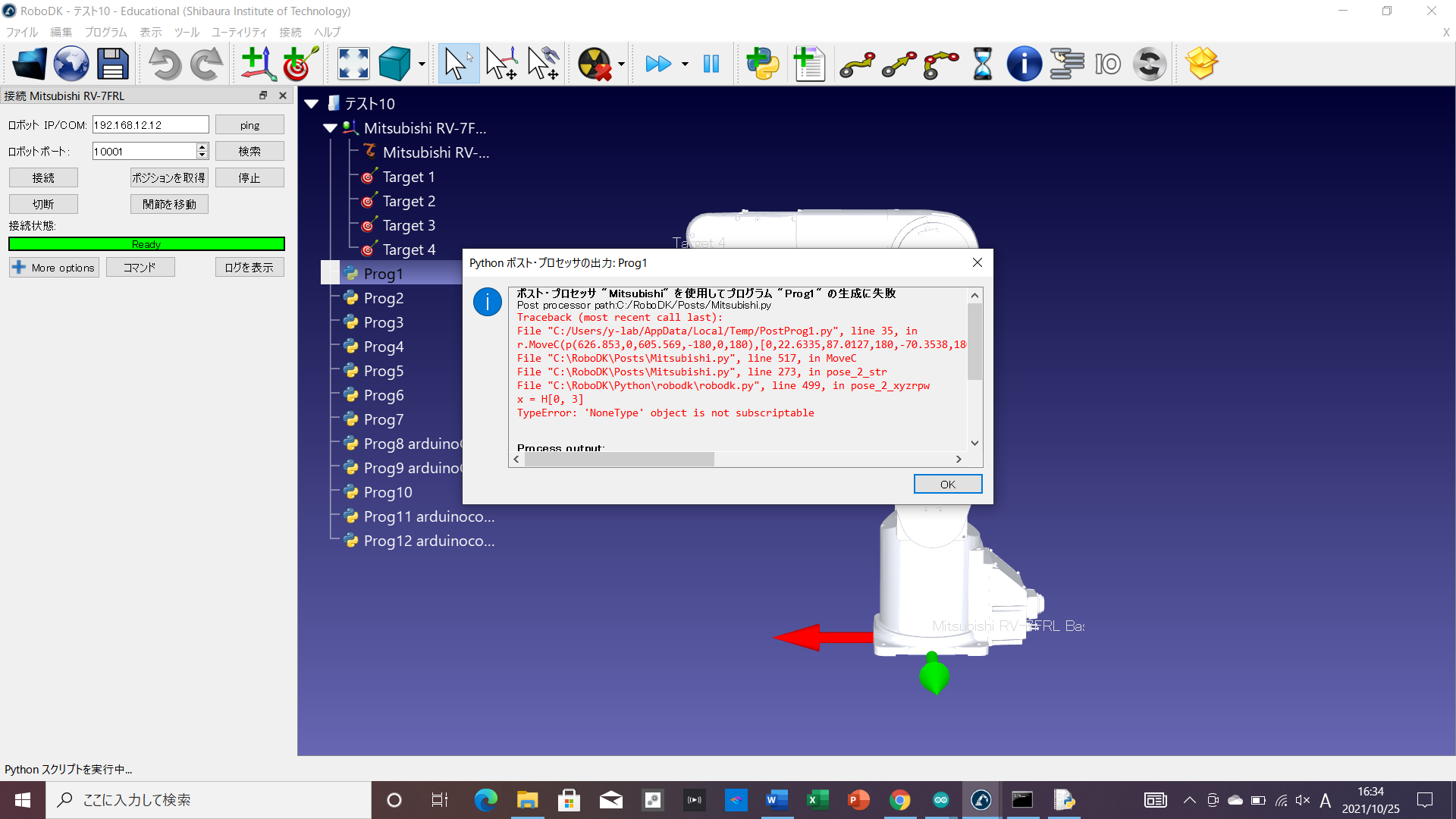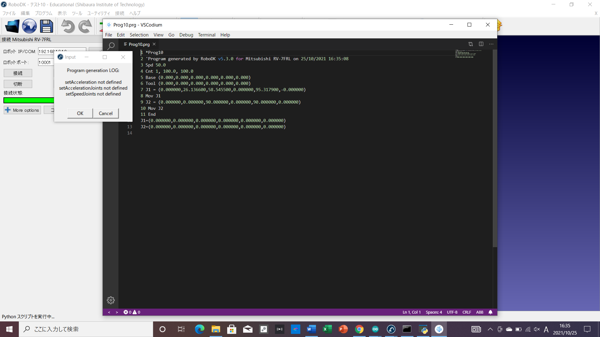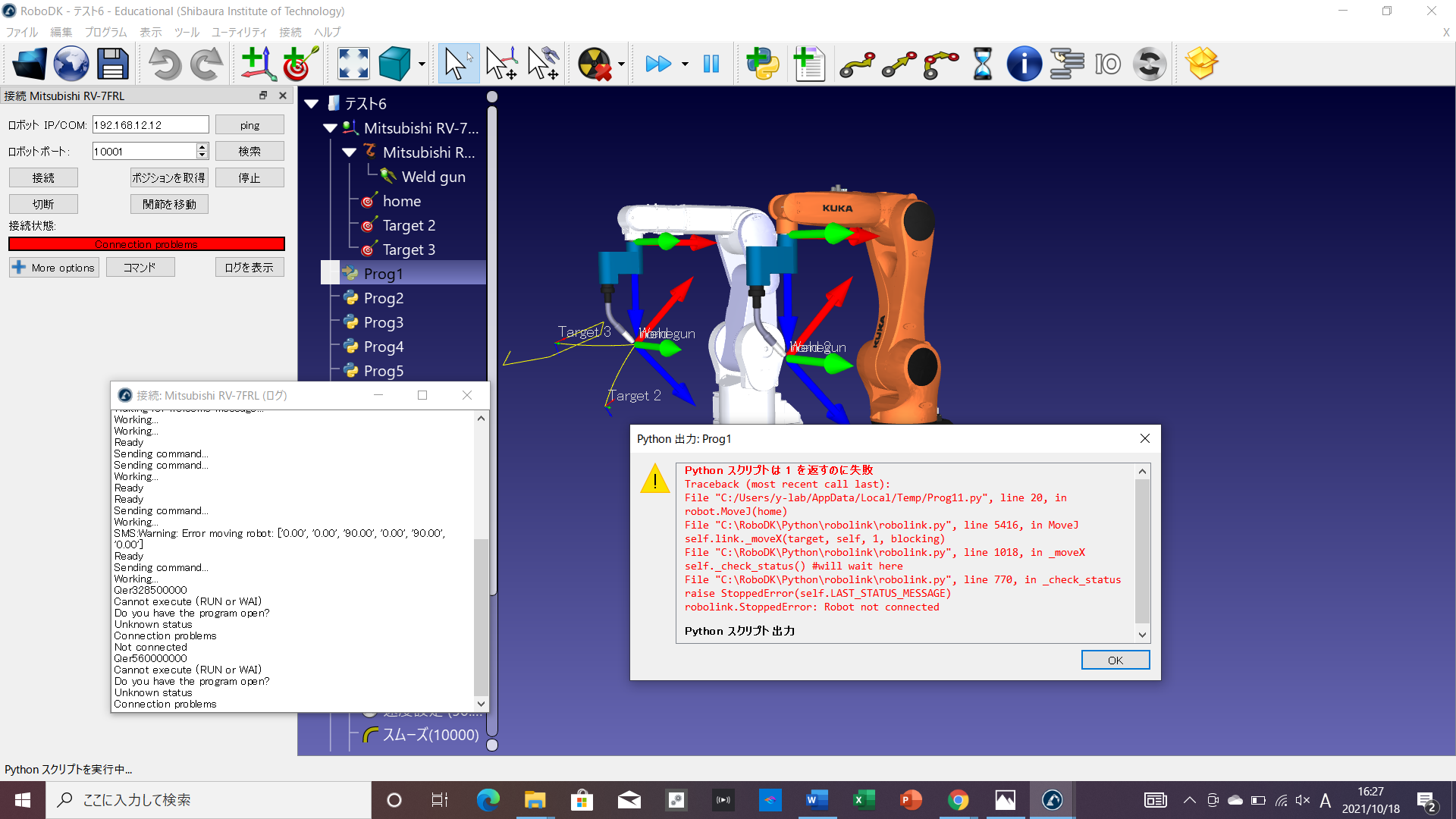 I'm trying to move Mitsubishi robot (Mistubishi RV-7FRL). But I can't run some python code on the actula robot. It is the code of the prog1 of the file attached(test6).
