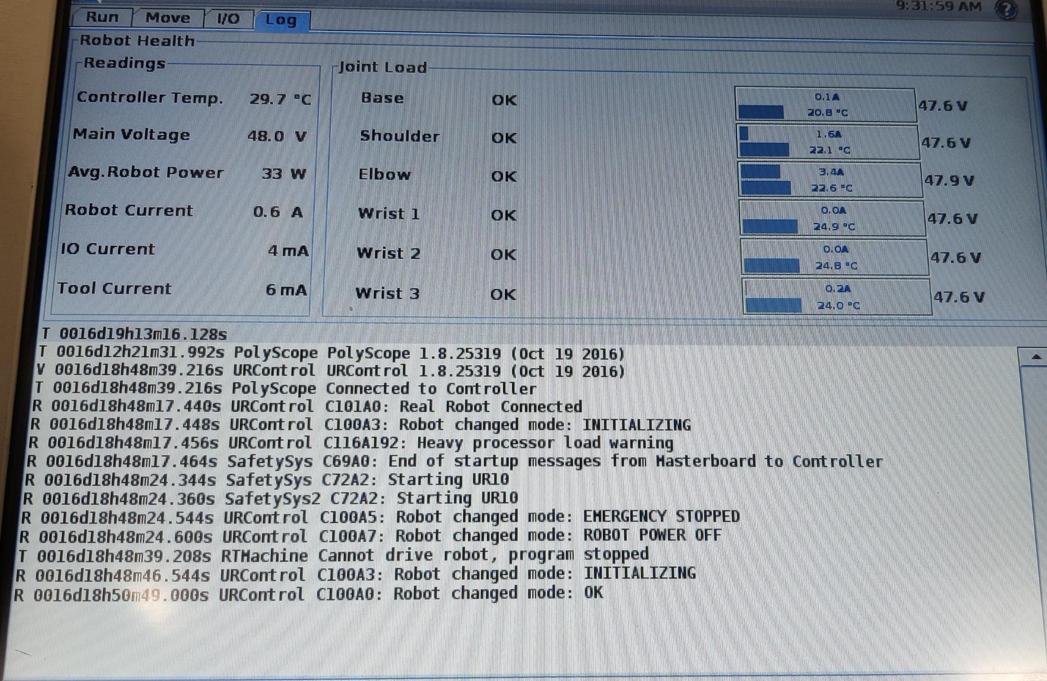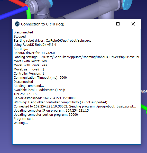 The log on the controller doesn't show anything at all when I try to connect. I have attached a screenshot of the robodk log and a couple others that may be useful. I am connecting through a direct cable connection to the control box.