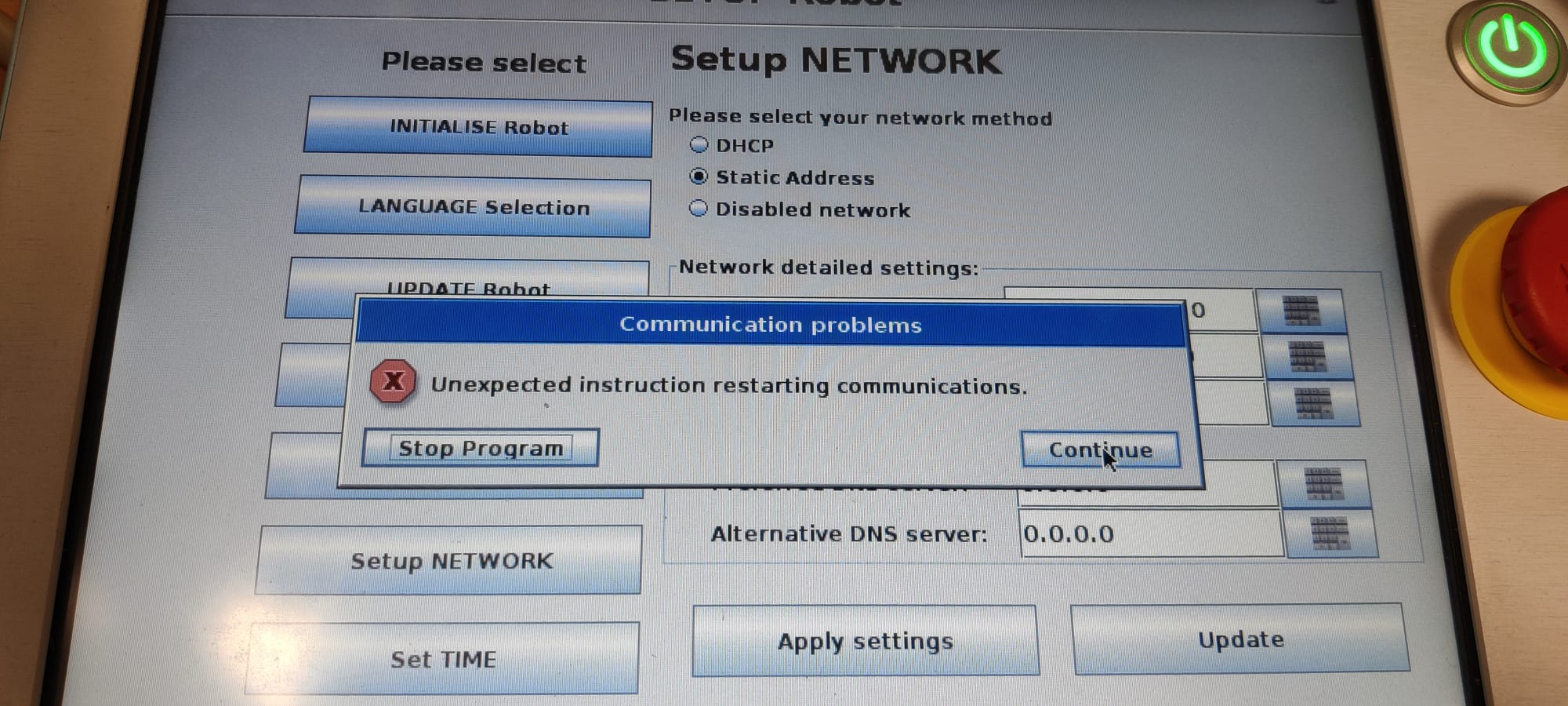 The robot is connected directly via a Network cable, and I am able to ping the robot, however when I get to actually connecting it will get stuck at waiting.